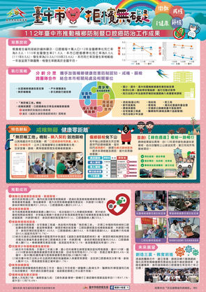 由成果海報可看出各縣市於新冠疫情緩解後回歸努力推動口腔癌防治,且海報製作 用心,因此在原有的績優獎項「防治力績優獎」和「特色成果獎」外,本屆特別增加海 報特色獎項「社區合作獎」、「協力推動獎」及「持續精進獎」,以表彰縣市之努力。